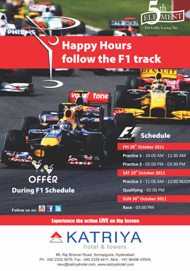 The event is organised to view and enjoy the happy hours throughout the F1 Schedule. The schedule begins on 28th Oct 2011 (Practice 1 – 10: 00 A.M -11.30, Practice 2- 2:00 Pm – 3: 30 P.M), on Oct 29th 2011 (Practice 3– 11: 00 A.M -12.00 Noon, Qualifying – 2:00 PM) and 30th Oct 2011(Race – 3:00 P.M). Katriya is offering the live shows on big screen with exclusive offers in the lounge bar. Katriya is situated in Raj Bhavan Road near Somajiguda, Hyderabad.