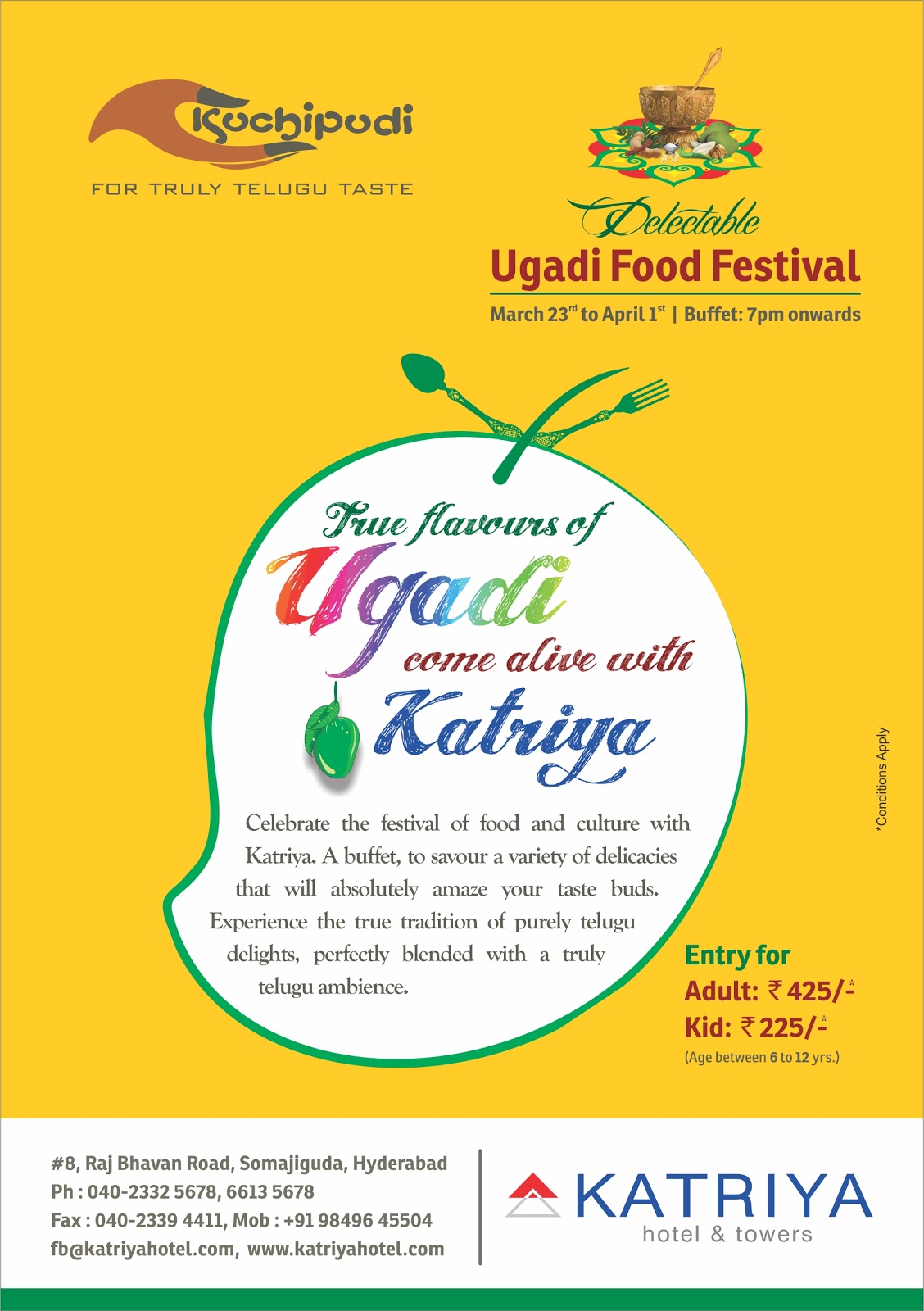 To bring in the true essence of the festive spirit, Katriya has organized a Food Festival for an entire week from March 23rd to Aril 1st2012. Celebrate the festival of food and festival at Katriya. A buffet, to savour a variety of delicacies that will absolutely amaze your taste buds. Experience the true tradition of purely Telugu delights perfectly blended with a truly Telugu ambience. True flavours of Ugadi come alive with Katriya. On this occasion, have a wonderful feast and a great dining experience with your friends and families. The buffet is available from 7 pm onwards at a price of entry for Adults at Rs. 425 and kid at Rs. 225.